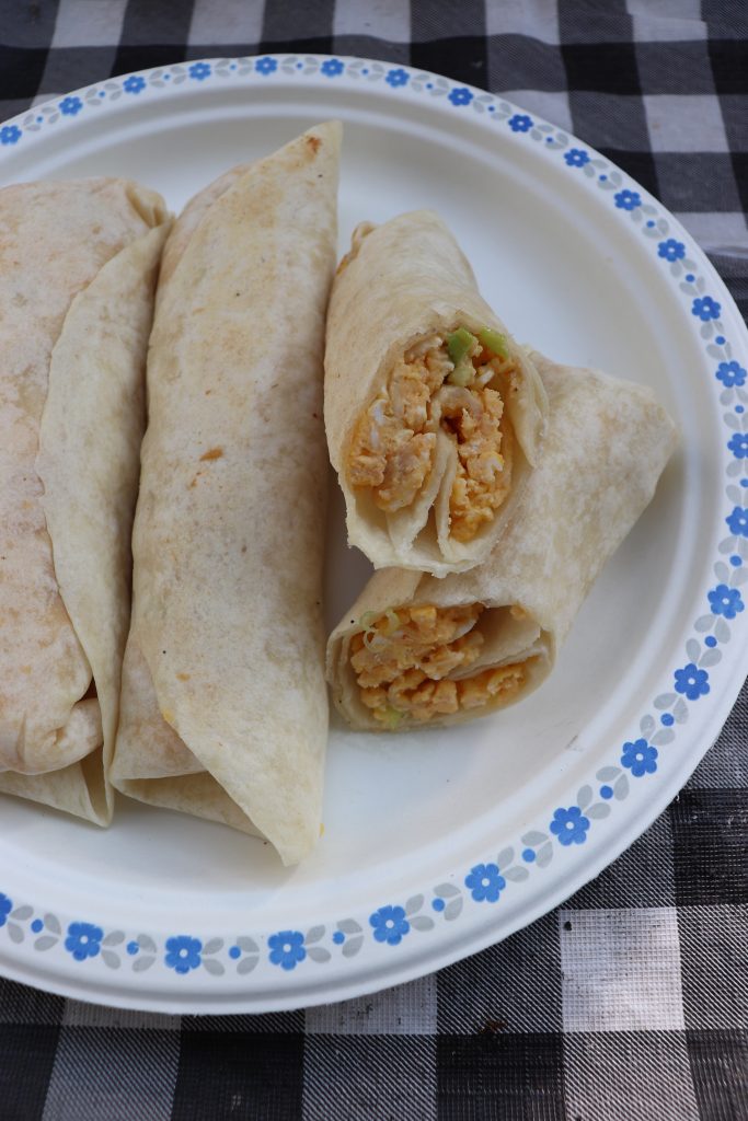 7. In the center of each tortilla, place a 1/2 cup of the egg filling.