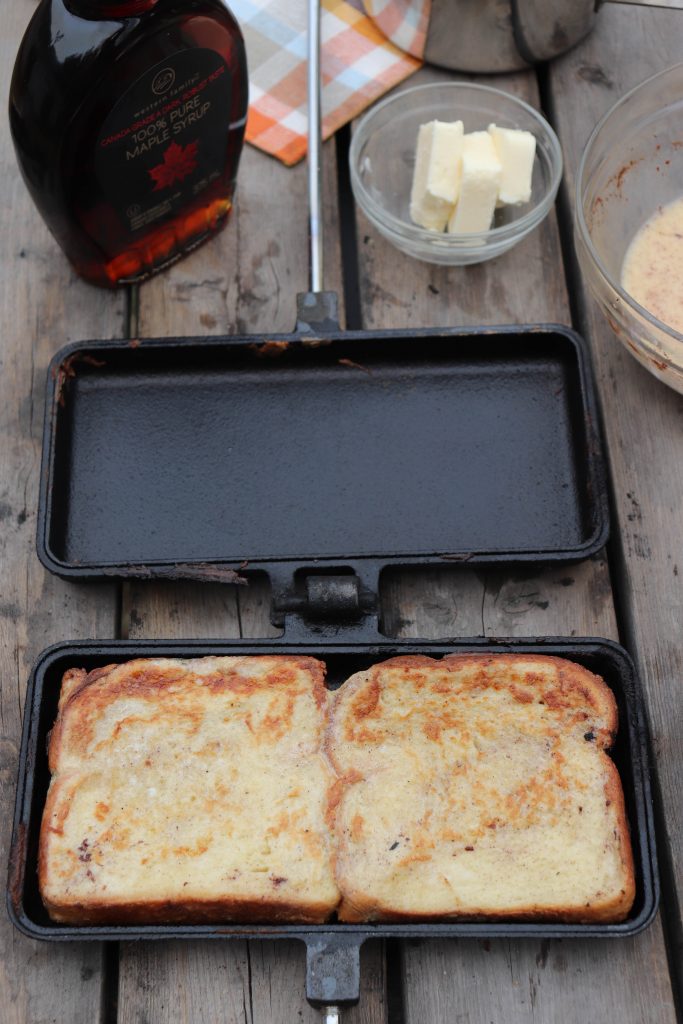 We like to use this double camp cooker from Woods whenever we’re making French toast, because you can cook two slices of bread at a time. Single pie irons, like the other ones we have, work, too.