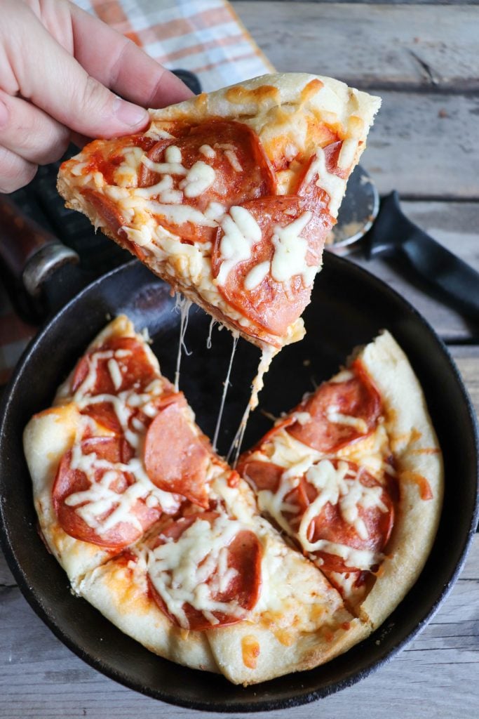 We used a 6″ skillet for individual-sized pizzas, but you could use a 10″ skillet for a larger pizza to feed a crowd.