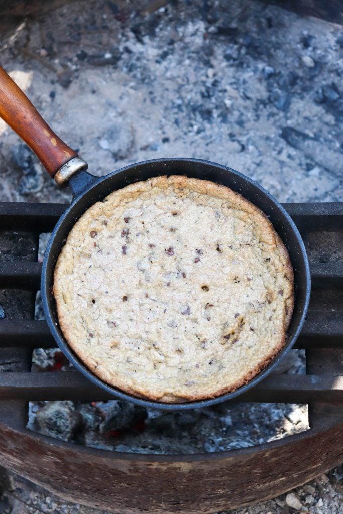 This skillet chocolate chip cookie is gooey, golden, and always a hit. Our kids request that we make cookies over the campfire every single day that we are camping and we’re happy to oblige!