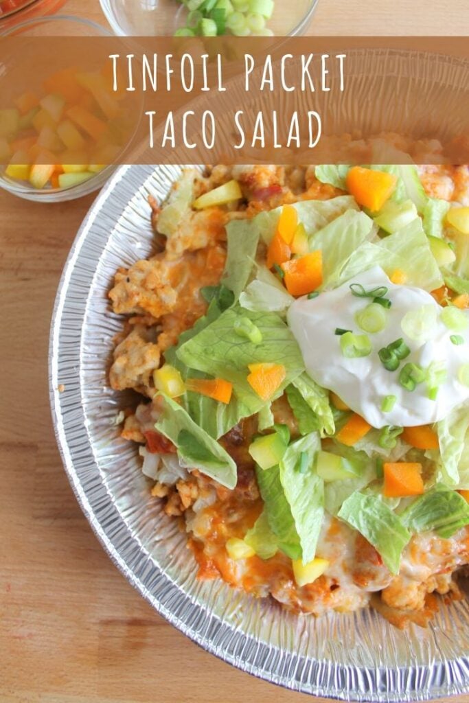 Today we are sharing this amazing tinfoil packet taco salad recipe that combines all of these things.