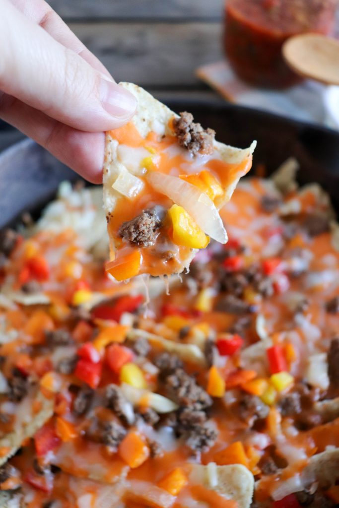 - Layer nacho chips, beef, peppers, onion, and cheese in a cast iron skillet.